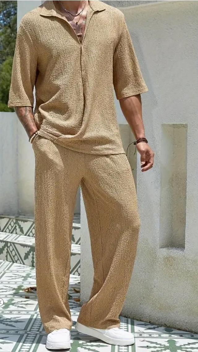 Solid Color Half-Sleeved Shirt Loose Drawstring Pants Men'S Casual Commuter Pants Set: Solid Color V-Neck Short Sleeve Shirt + Ripple Pattern Long Pants Two-Piece Set